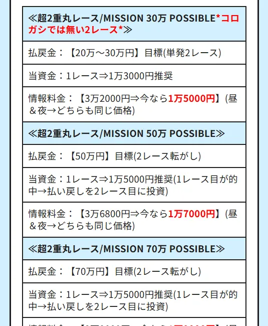 | MISSION30万POSSIBLE | 単発2レース | 1レースあたり13,000円 | 20~30万円 | 32,000円 | 値引き後15,000円 |