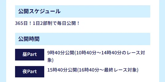 - 公開時間・夜Part:15時40分公開(16時40分~最終レース対象)
