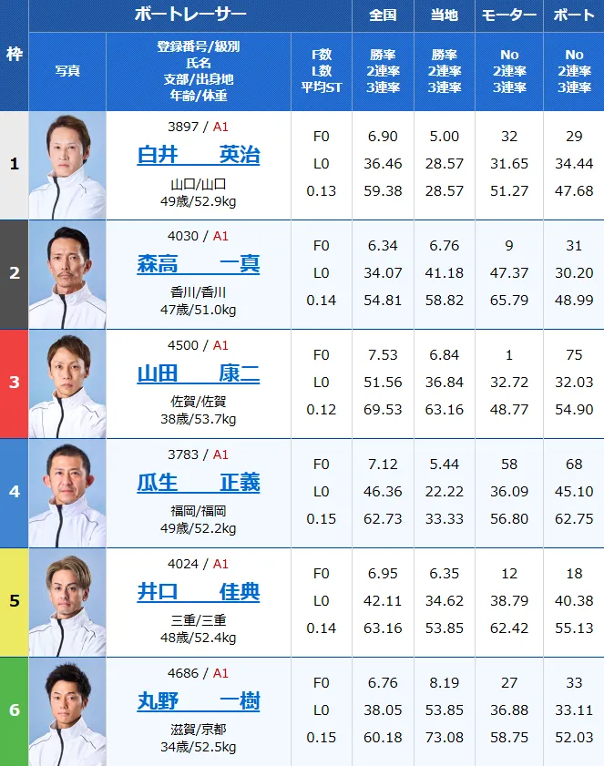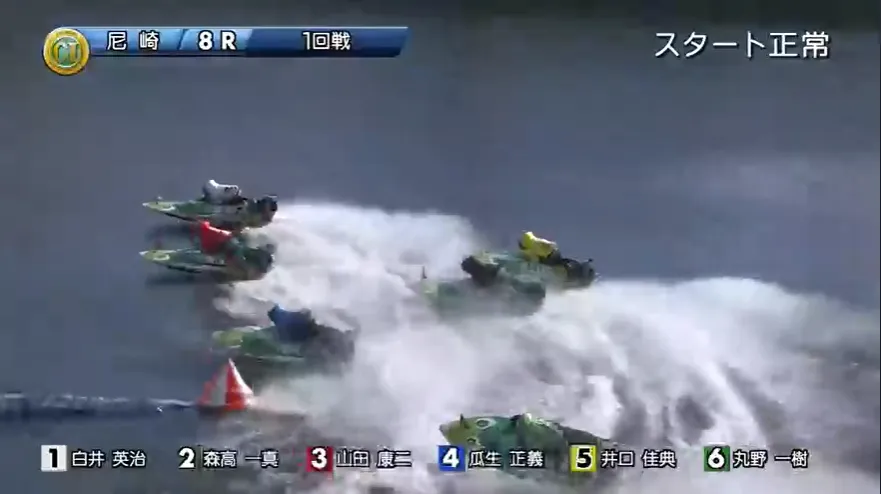 1号艇・白井英治がコンマ台の踏み込みからインを死守し、先マイ体勢に入ります!