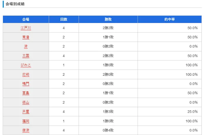 30日間の無料予想の会場別成績は上記のようになっていて、まんべんなく色んなレース場の予想をしているという印象を受けます。