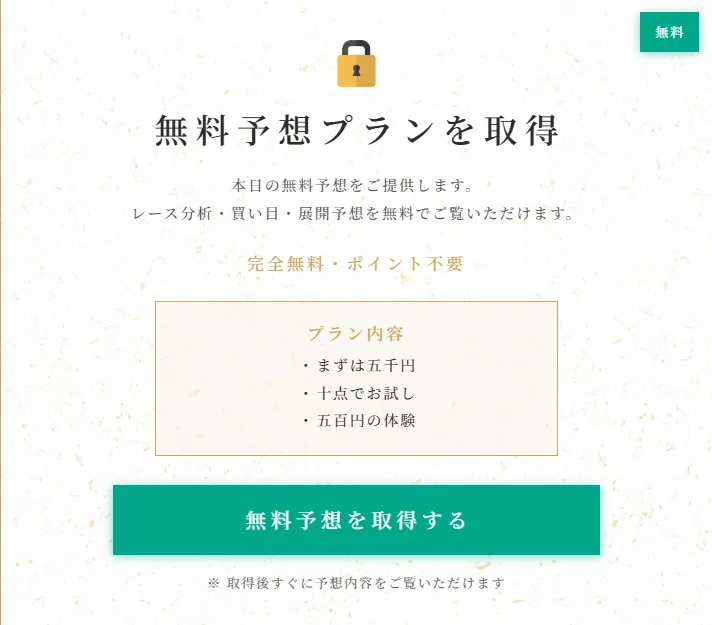 さらに付け加えるならば、この3プランは会員登録特典の100ptで購入できるのだ。つまり扱いとしてはほぼ無料予想に等しい。