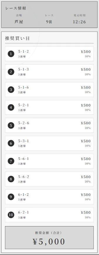 無料予想は毎日1レース。8:00に頃には公開されているようだ。舟券代5000円で、目標2万円。3連単10点。