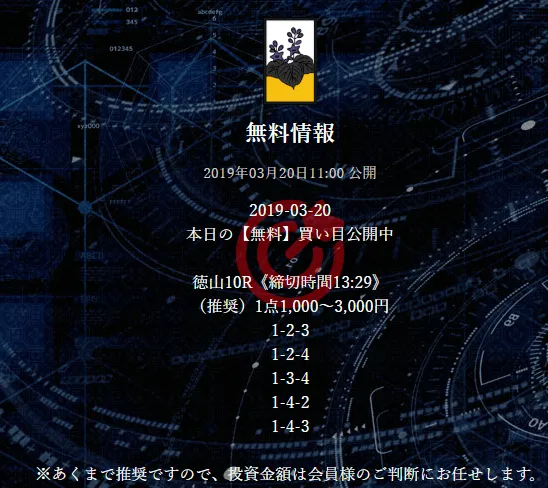 無料予想は毎日無休で1日2レース。11:00と18:00頃に公開される。3連単、買い目点数は記述なし。舟券代1万円で3万円回収が目標だ。