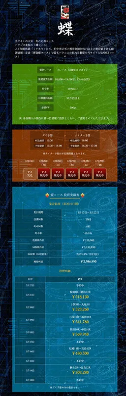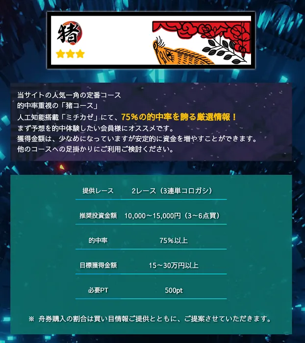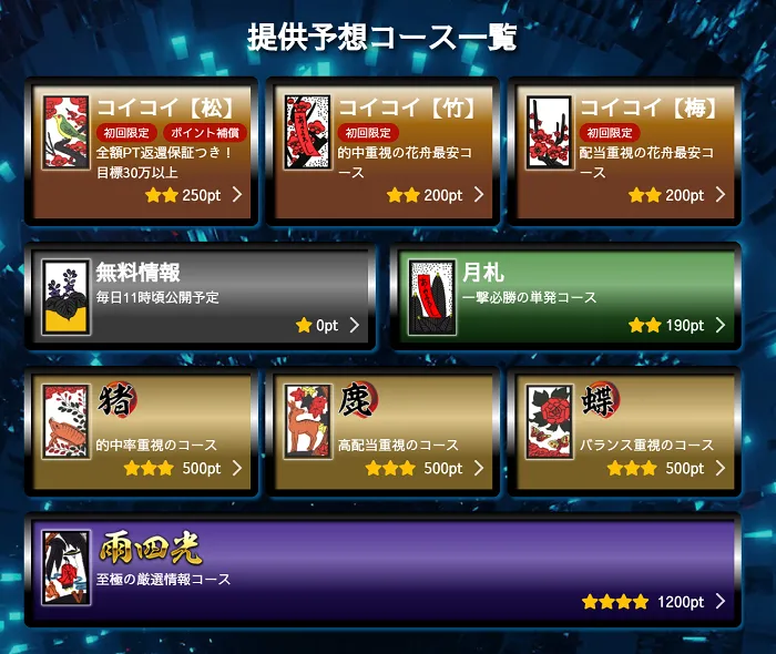 190ptの「月札」は1レースで12万~50万を狙う予想のため、必然的に中穴以上の狙いとなり、的中率が低い。初課金をするなら「コイコイ」一択となるだろう。