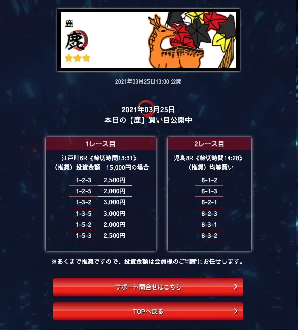 鹿は元々的中率低めのコースだからぶっちゃけちょっと心配でしたけどw直近の結果ではまずまずだったし的中実績信じて選んで良かったぁ~。花舟の有料予想最高だわ!