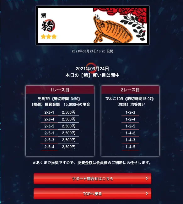 しかし直近の的中・不的中を明らかにしていること、しかもコース申込みと同じページ内で公開している点は、ユーザーからすると買う買わないを判断しやすい作りと言えますね。
