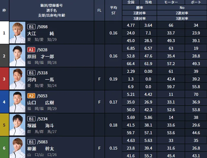 出走表を見ると1・2・4・6号艇がA2級、3・5号艇がB1級となっていますが、F持ちも多く素人が容易に予想できるレースでないことは一目瞭然。