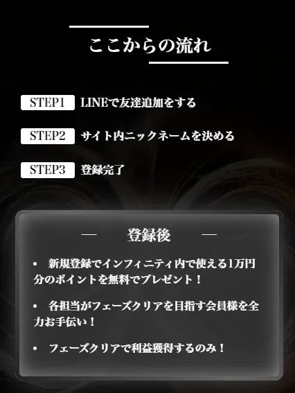 さらに気になるのが、登録フォームの下にある「ここからの流れ」「利益獲得の仕方」「フェーズの詳細」「的中実績」というメニューたち。