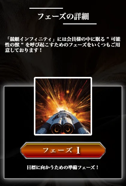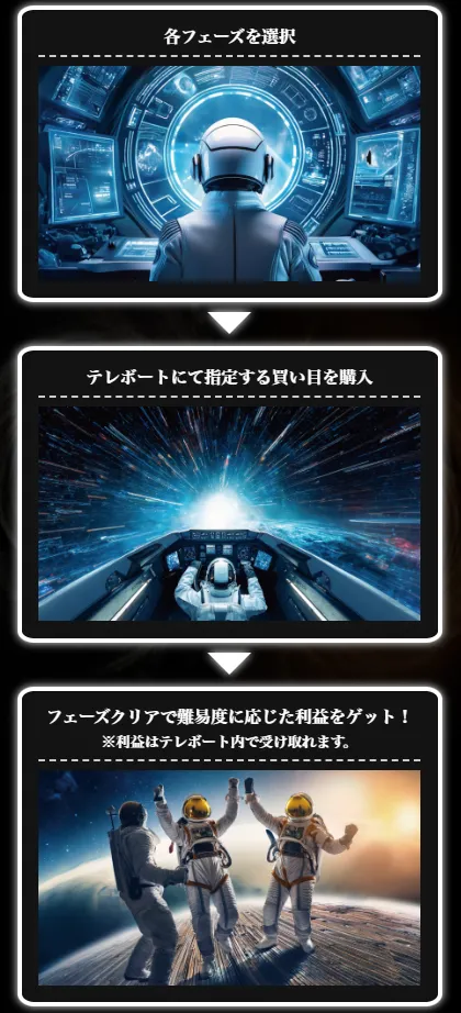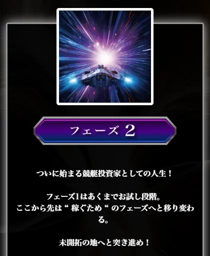 「利益獲得の仕方」を見てみると、「各フェーズを選択」→「指定する買い目を購入」→「フェーズクリアで利益ゲット!」と何を言っているのか分からないページが出てきました。