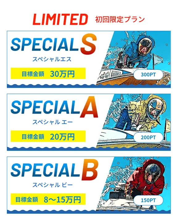 | スペシャルB | 1レース | 3連単 | 2~10点 | 15,000円 | 8~15万円 | 150PT | 初回限定 |