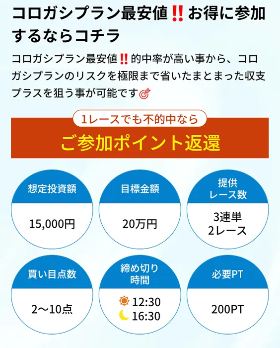 | スタンダード | 2レースコロガシ | 3連単 | 2~10点 | 15,000円 | 40万円 | 400PT | セレクトプラン |