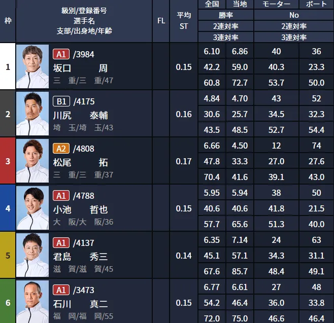 4号艇・木場雄二郎はボートの連対率が高く、5号艇・星野太郎はA2かつモーターの連対率が高いので、内枠の選手を上手くかわせれば、舟券に絡むことができるでしょう。