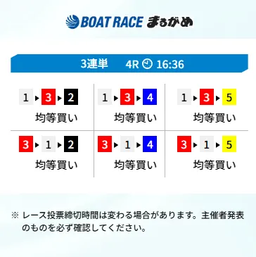 買い目は6点で1号艇と2号艇を中心とした予想、各2,500円ずつ配分しています。