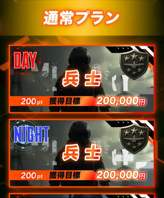 | 兵士 | 200pt | 2レース(コロガシ) | 3連単 | 5点 (1点2,000円) | 200,000円 | 通常プラン |