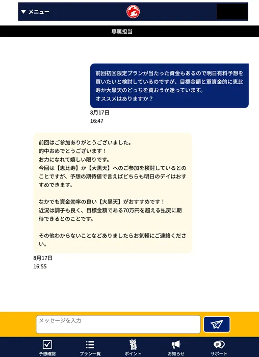今までだったら的中実績の結果と流れだけをみて「二鷹」を買っていたかもしれませんが、担当者さんがしっかり予想メンバーと連携していて、情報を持っているのが好印象でした!