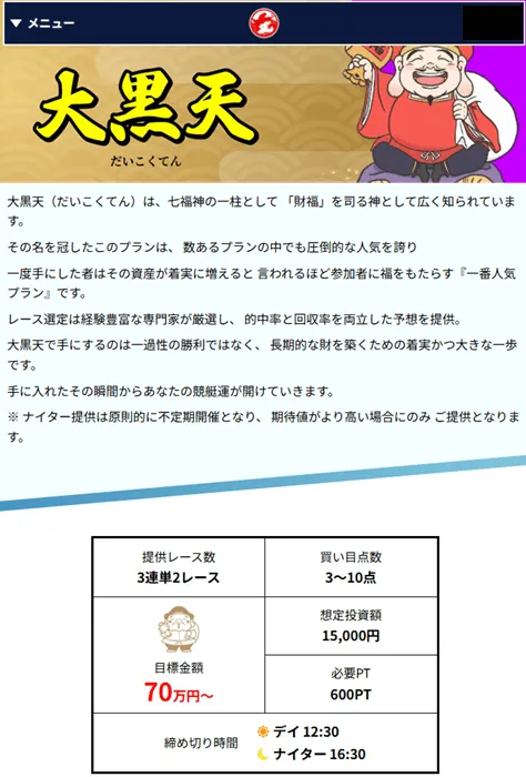 | 大黒天 | 3連単2レース | 3~10点 | 15,000円 | 70万円~ | 600pt | 通常プラン |