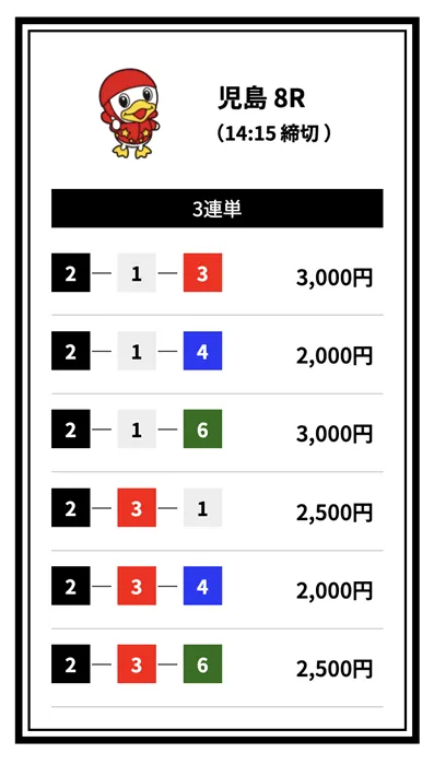 | 二鷹 | 3連単2レース | 3~10点 | 15,000円 | 30万円~ | 200pt | 初回限定 |