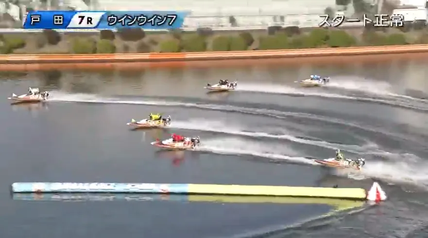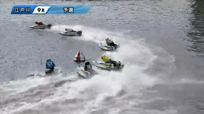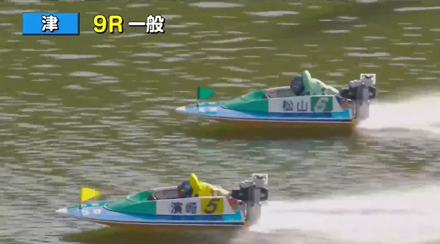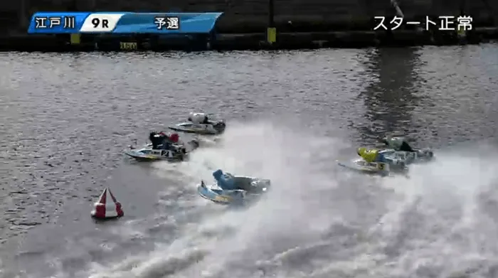1周目の第1ターンマークでは、1号艇・森林太と2号艇・香川陽太が大きく外に膨らむ!