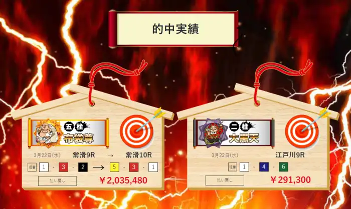| 二柱大黒天(デイ・ナイター) | 単発2レース | 記載なし | 300pt | 25万円 |