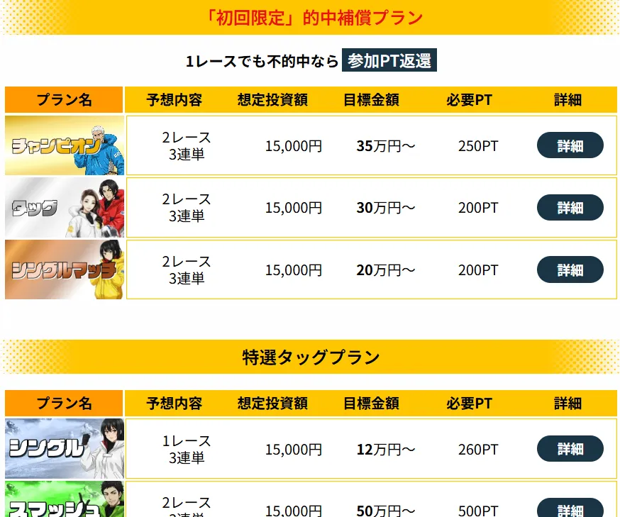 「チャンピオン」「タッグ」「シングルマッチ」といった初回限定プランには、1レースでも不的中だった場合は全額ポイントが返ってくる補償が付いています。