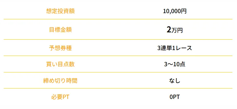 シングルマッチ | 2レース3連単 | 15,000円 | 20万円~ | 200PT | 初回限定プラン |
