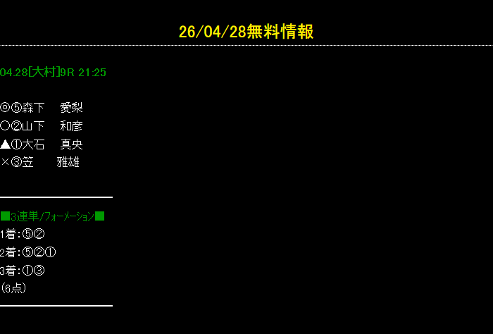 大村競艇で今日4月28日(火)行われる競艇レースの無料予想を掲載しております。