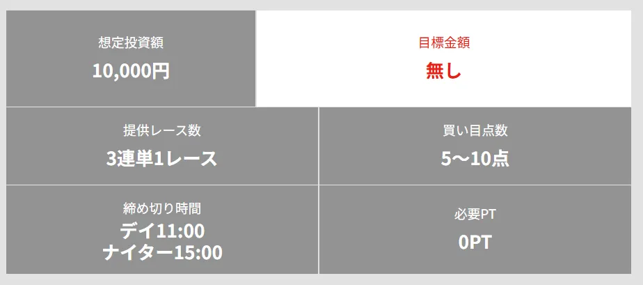 | プラン名 | 目標金額 | 想定投資額 | 提供レース数 | 買い目点数 | 必要PT | 備考 |
