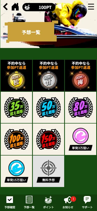 「松」「竹」「梅」と3種類あるが、的中率はさほど差がないので、初課金は高回収の「竹」が良いと思われるが、各プランの詳細にある直近2週間の成績を見て判断してほしい。