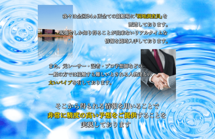 「現地調査員」や「元レーサー・記者・プロ予想師などとの太いパイプ」など、予想サイトのテンプレートを詰め合わせたようなよく見る言葉ばかりです。