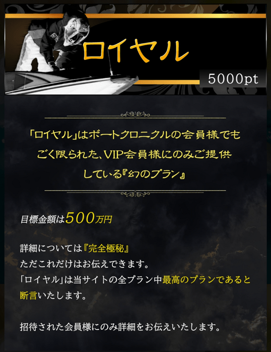 また、ロイヤルは5点各2,000円の投資で5,000,000円が目標とのことですが、これは万舟券を2回連続で当てなければならず、5点でやれるのかちょっと信じがたいプランです。