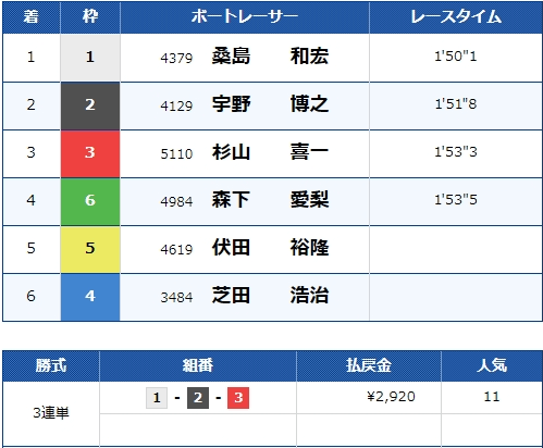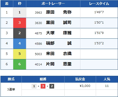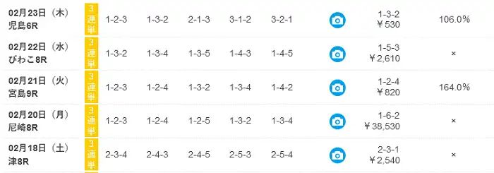 | 2月23日(木)児島6R | 1-2-3、1-3-2、2-1-3、3-1-2、3-2-1 | 1-3-2 | 530円 |