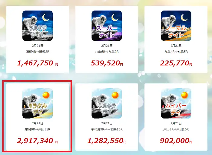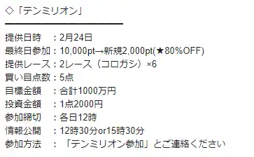 | ミラクルデイ | 2,500,000円 | 2レース | 5点 | 10,000円 | 2,500pt |