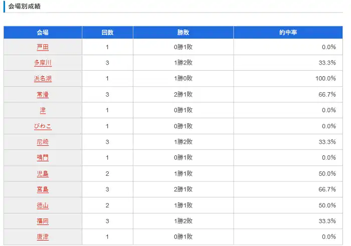 こちらのサイトの1ヶ月間の無料予想の会場別成績はこのようになっています。
