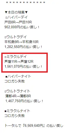 メール限定のテンミリオンでは射幸心をあおるために、毎日のようにその日の的中実績を載せてきます。