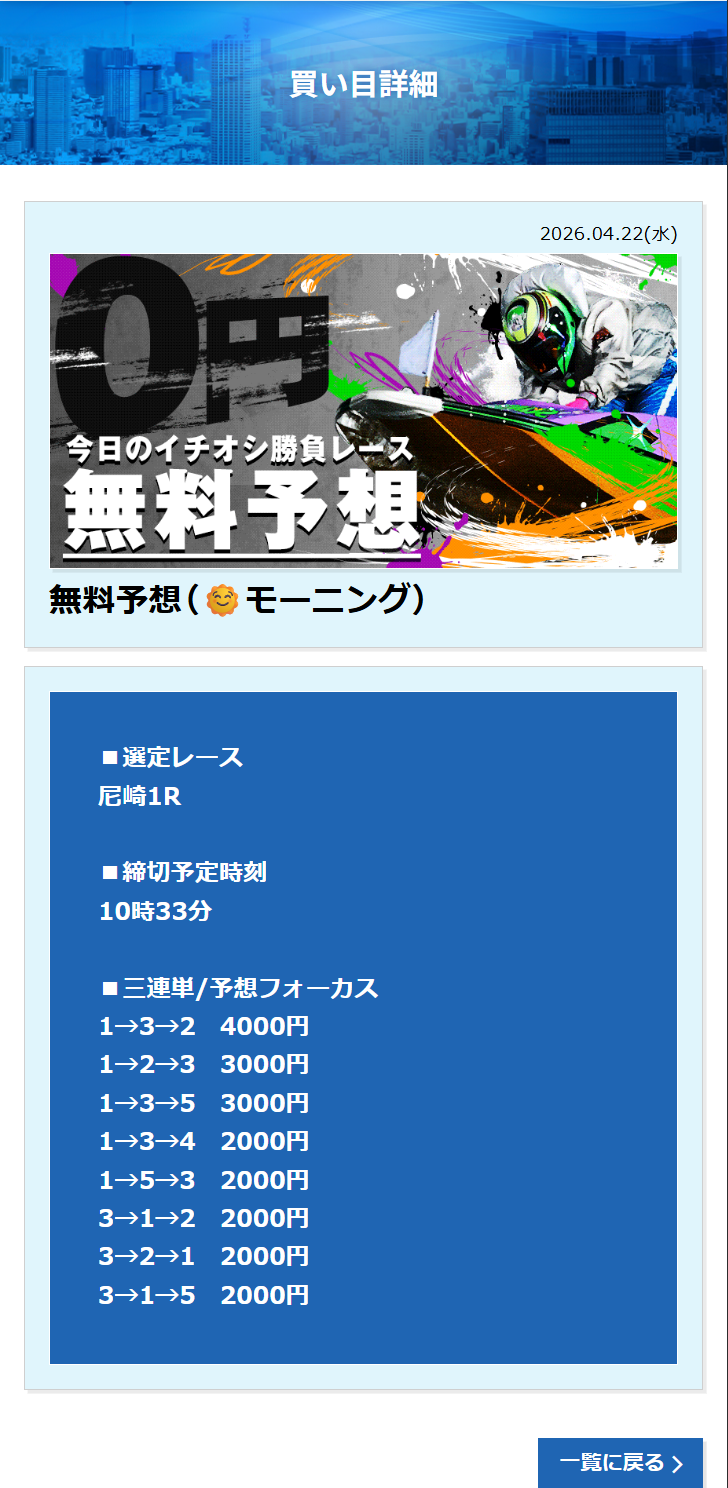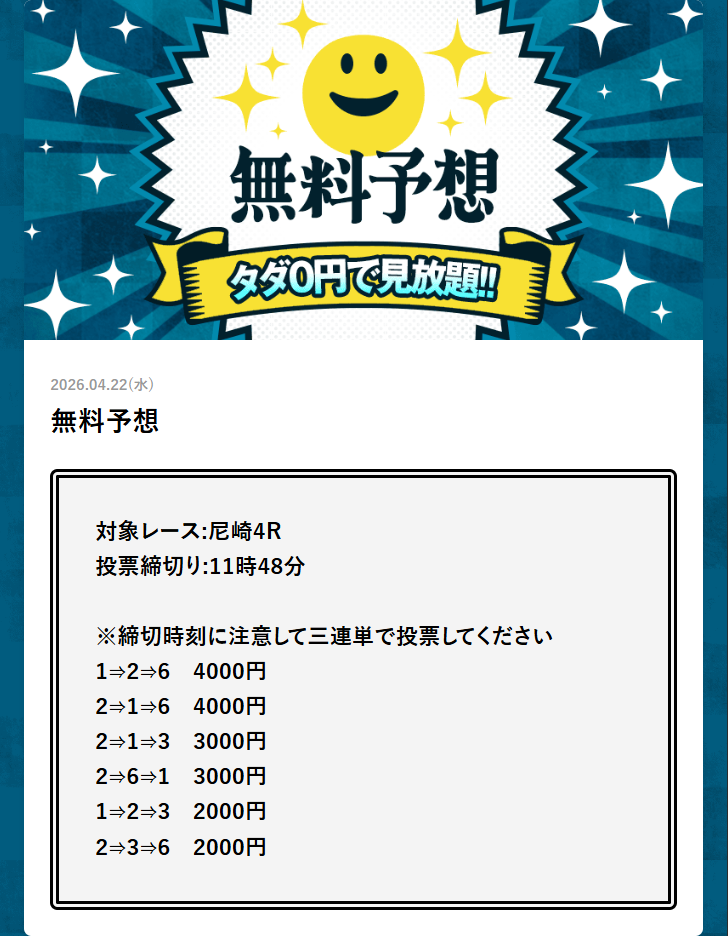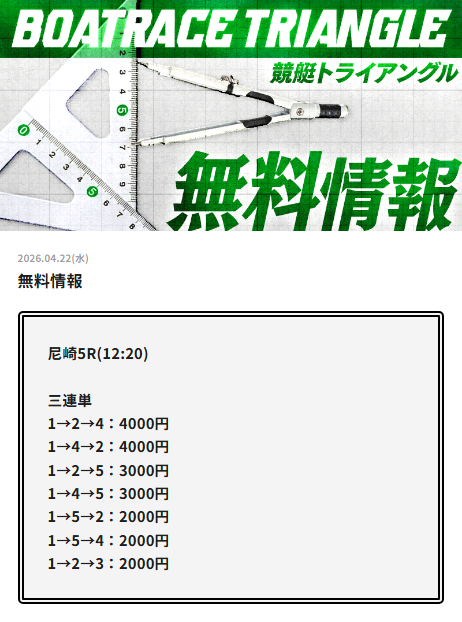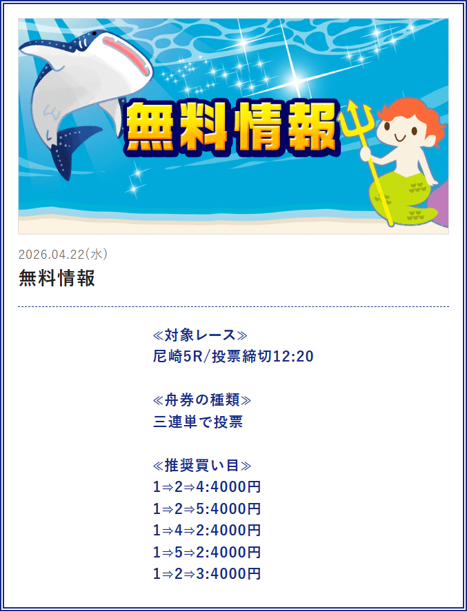 尼崎競艇で今日4月22日(水)行われる競艇レースの無料予想を掲載しております。