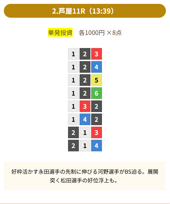 全国屈指の静水面のため、1号艇がそのまま1位になることも多い芦屋競艇場。