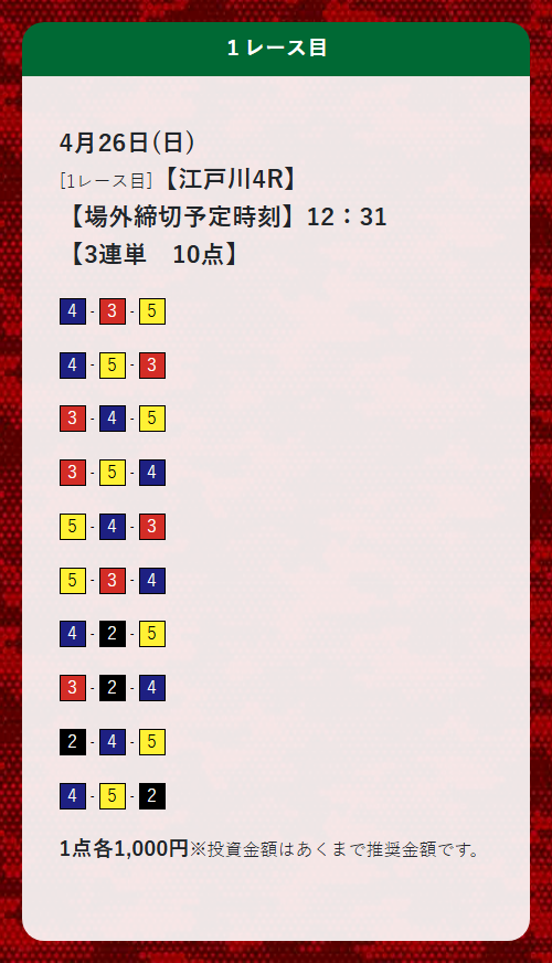 江戸川競艇で今日4月26日(日)行われる競艇レースの無料予想を掲載しております。