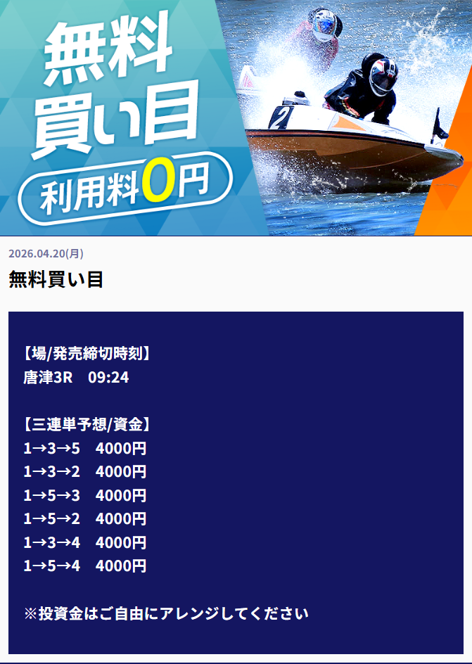唐津競艇で今日4月20日(月)行われる競艇レースの無料予想を掲載しております。
