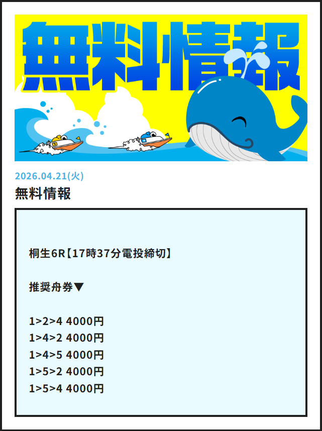 桐生競艇で今日4月21日(火)行われる競艇レースの無料予想を掲載しております。